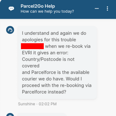 According to parcel2go, Evri do not offer the service I booked in my area. But this was only discovered after wasting a week of my time waiting for evri to collect the item which included reaching out to Evri several times to no avail – leave messages, call – no one is home. This is what parcel2go said: “when we re-book via EVRI it gives an error: Country/Postcode is not covered”